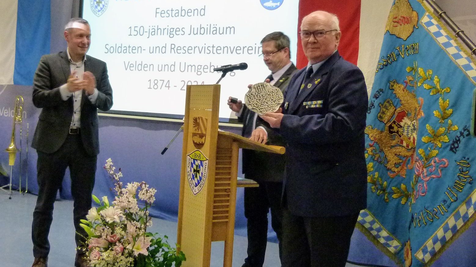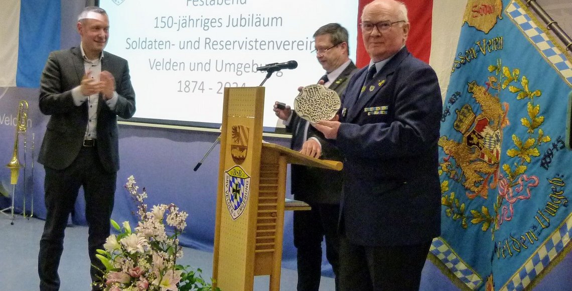 Kurz vor Ostern begannen die Feierlichkeiten zum 150-jährigen Bestehen des SRV Velden und Umgebung in der Musikhalle in Velden. Ein weiterer Festtag findet am Sonntag, 16. Juni, um 9 Uhr mit Kirchgang und Gedenken am Kriegerehrenmal sowie anschließenden Beisammensein statt. Den Kommersabend nahm Bezirksgeschäftsführer Dirk Mewes zum Anlass, dem Verein für seine Treue und Unterstützung im Bezirksverband Mittelfranken, besonders bei der jährlichen Haus- und Straßensammlung zu danken.