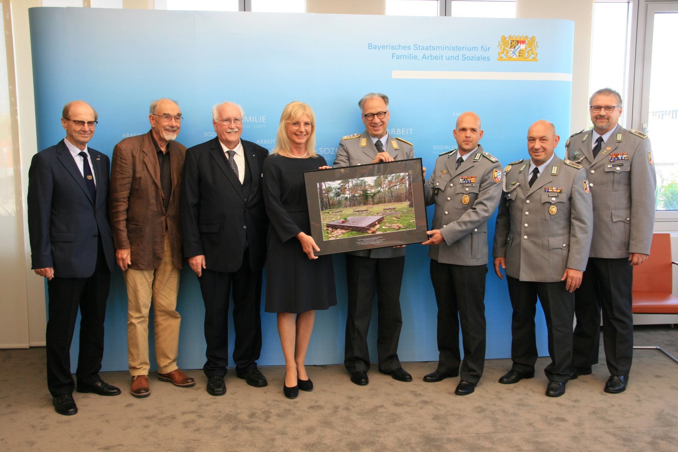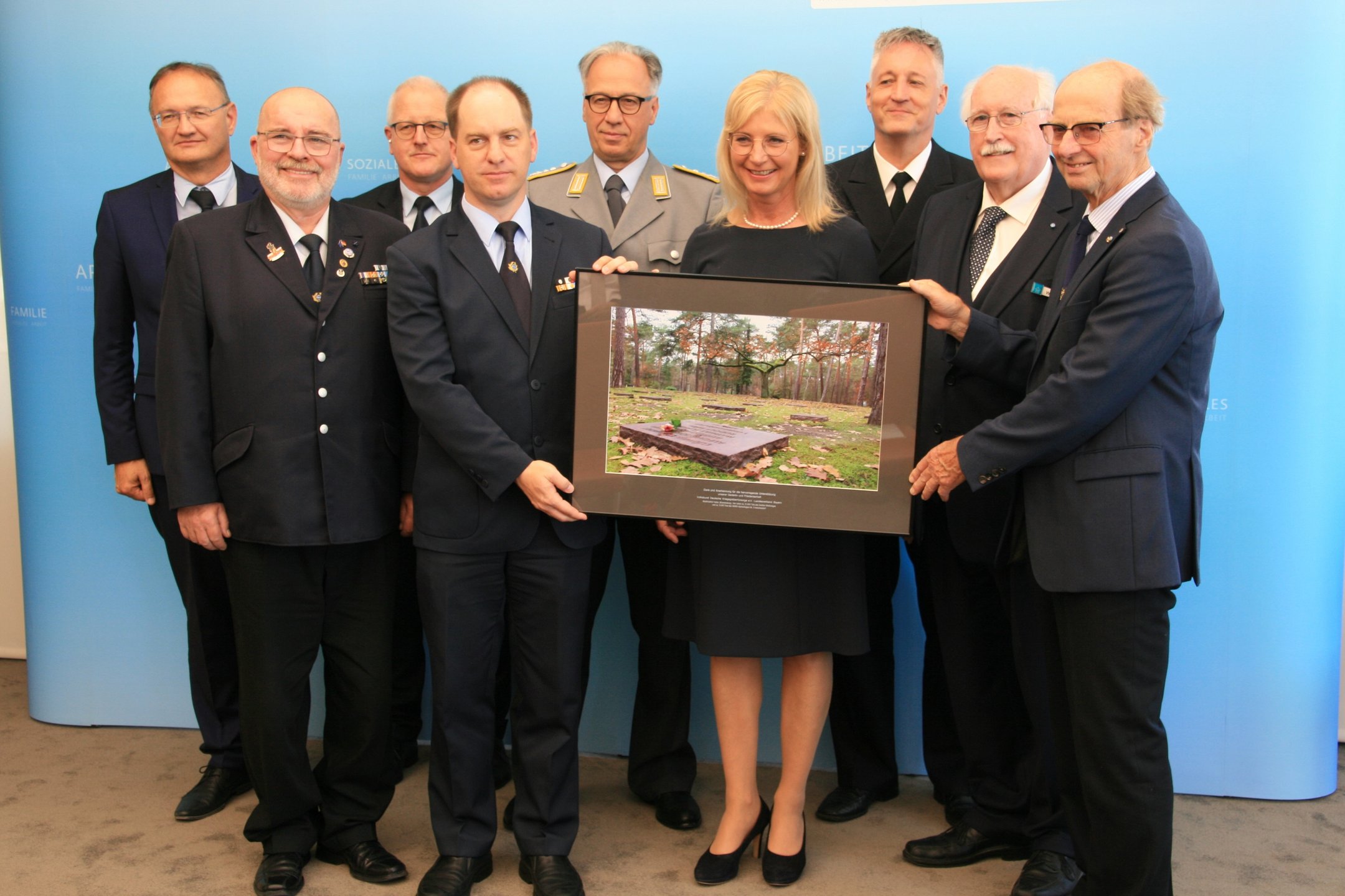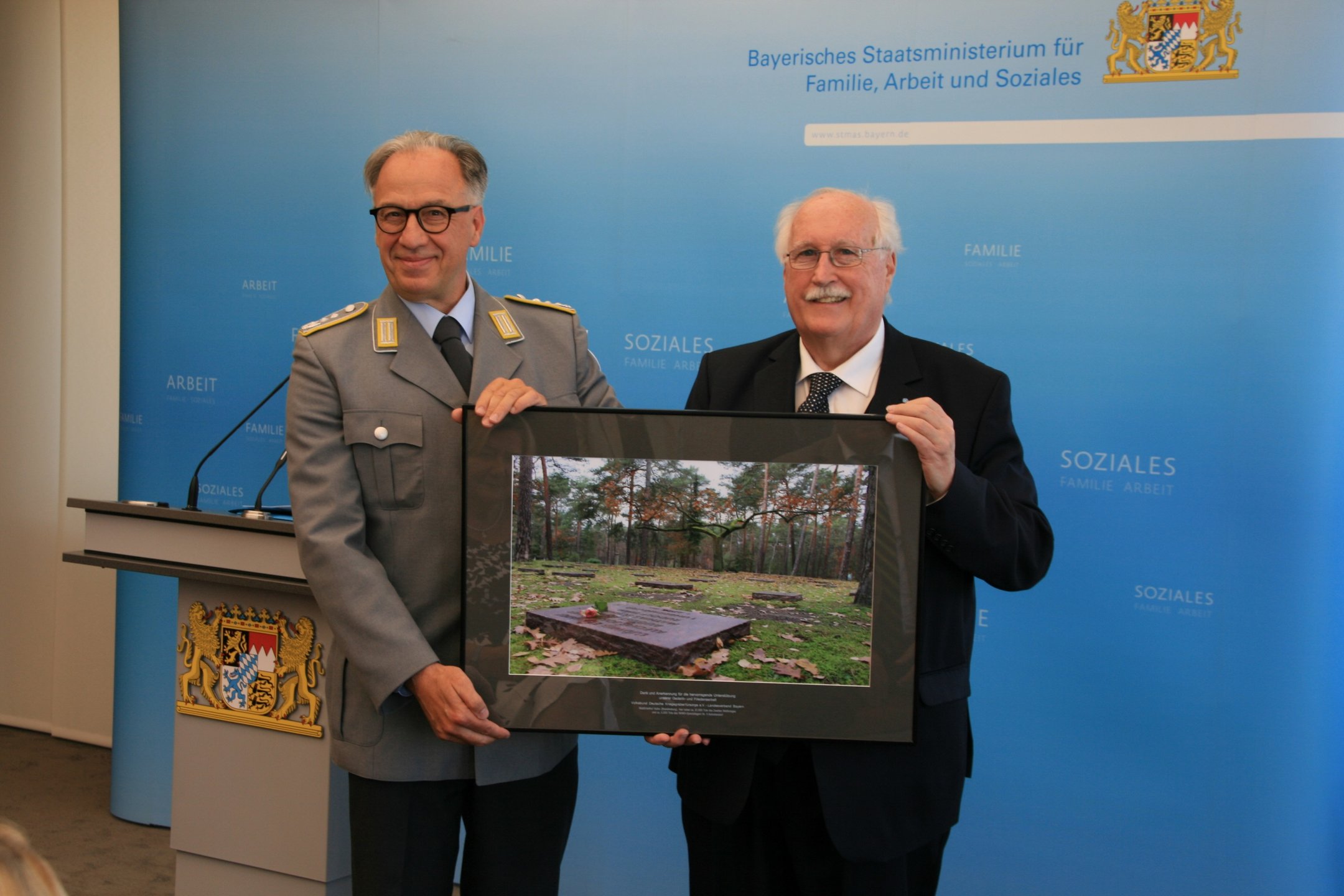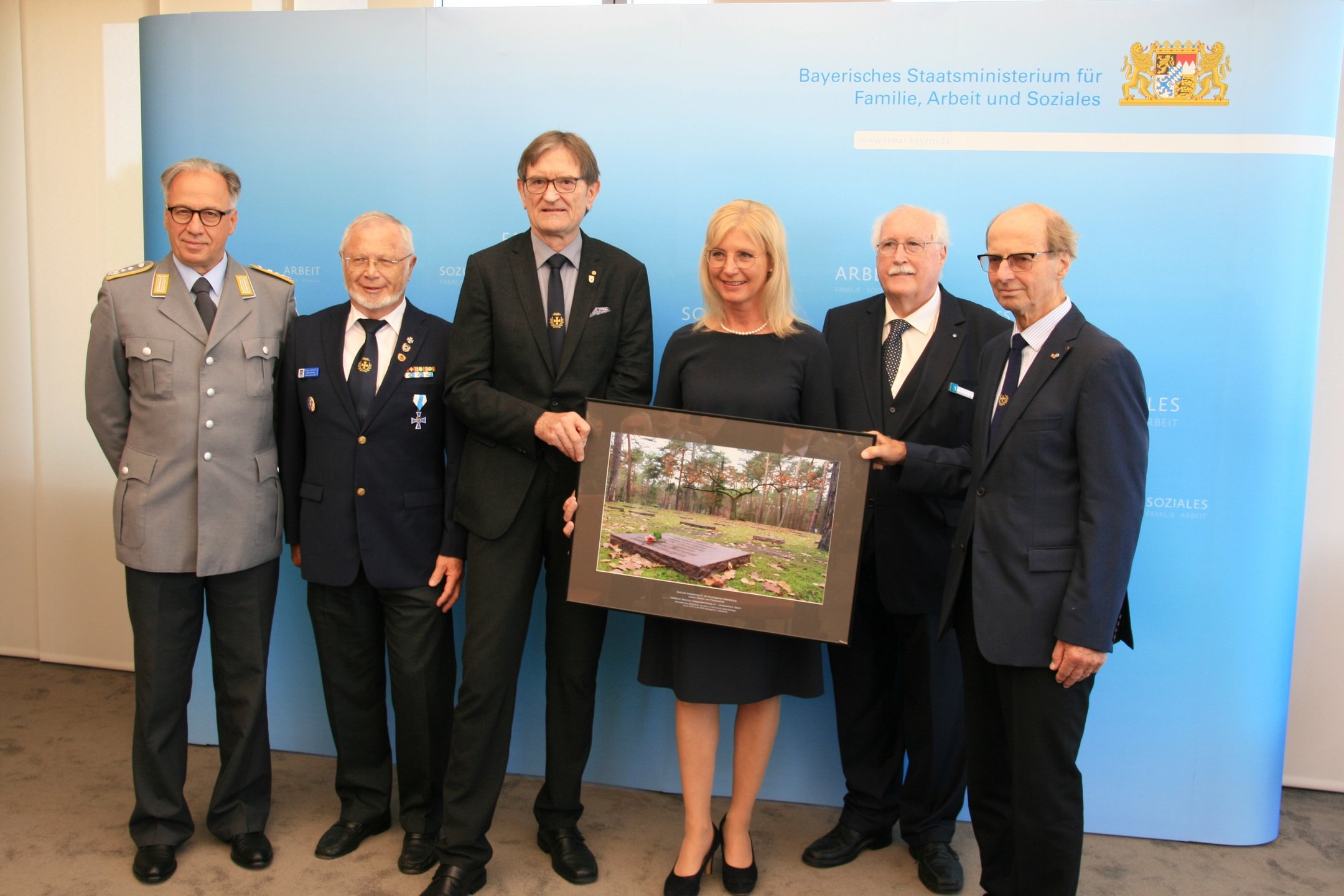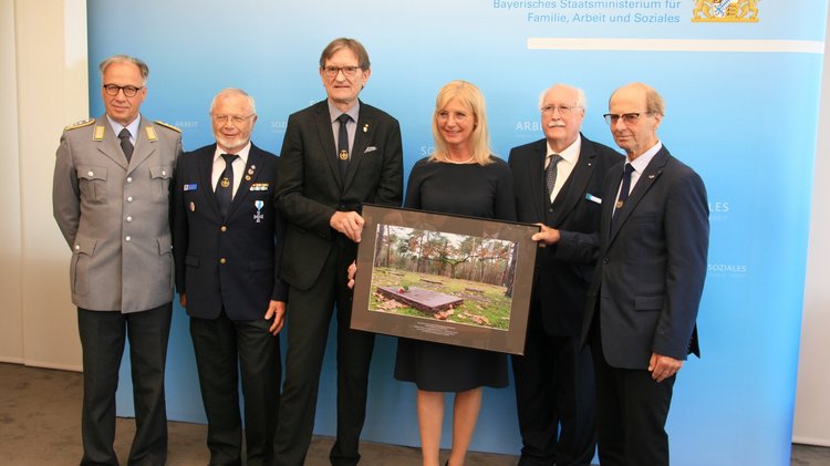 Als Zeichen der Verbundenheit und des Dankes für die Unterstützung überreichte Volksbund-Landesvorsitzender, Regierungspräsident a.D. Wilhelm Wenning, die Großaufnahme auch als Zeichen des Danks an Ministerin Ulrike Scharf sowie an das Landeskommando Bayern, die Arbeitsgemeinschaft der Reservisten-, Soldaten- und Traditionsverbände in Bayern, die Bayerische Kameraden- und Soldatenvereinigung (BKV), den Verband der Reservisten der Deutschen Bundeswehr (VdRBw) und den Bayerischen Soldatenbund 1874 (BSB). Mit sehr persönlichen Worten dankte BSB-Präsident Oberst a.D. Richard Drexl, dessen Onkel auf der Kriegsgräberstätte Halbe ruht.