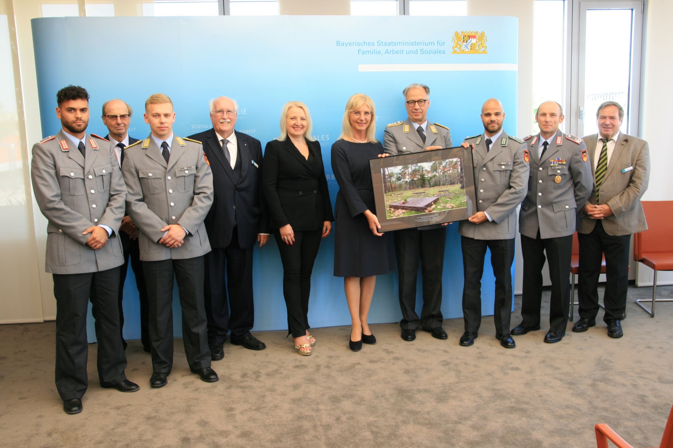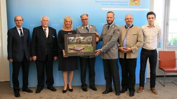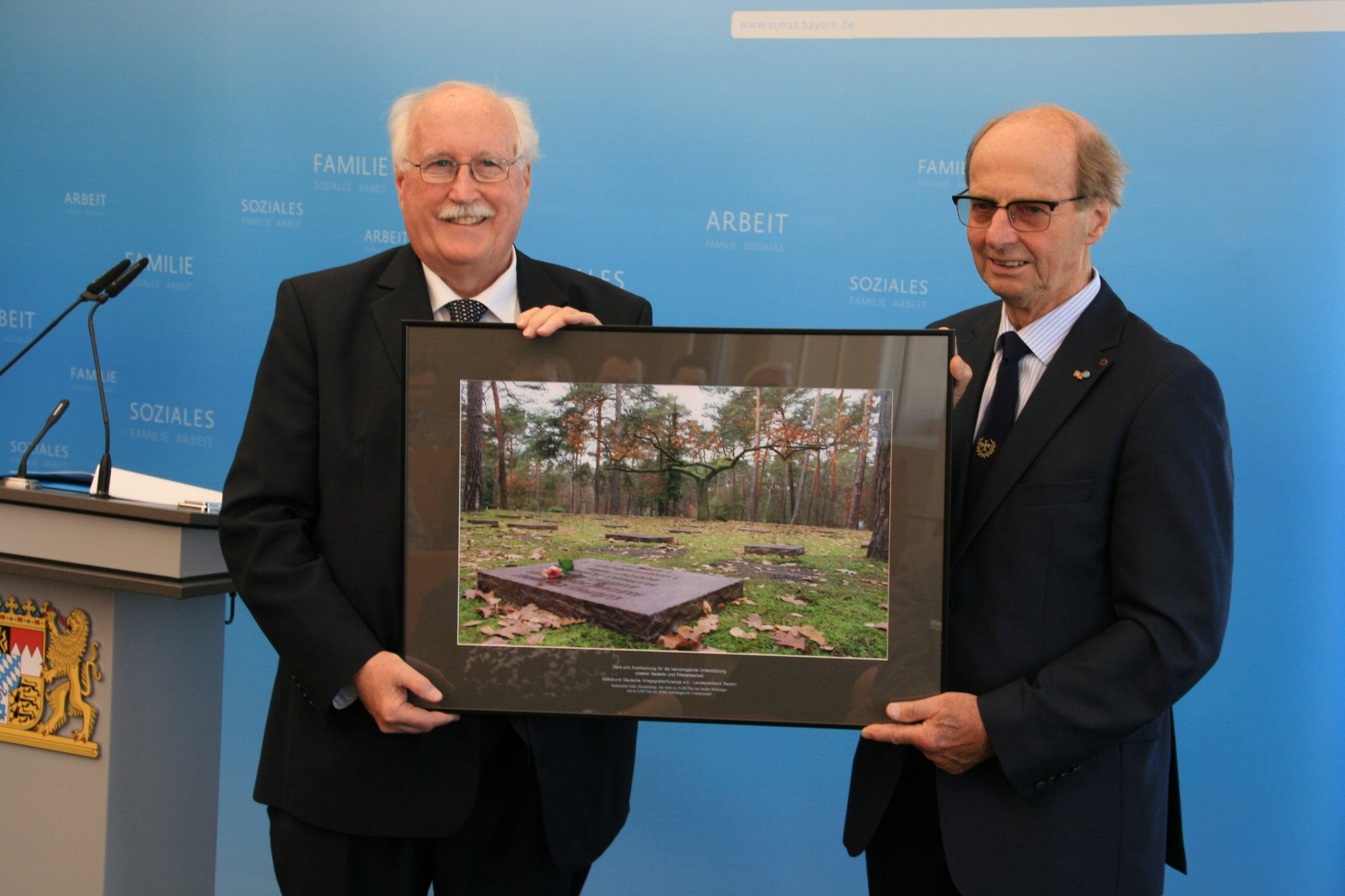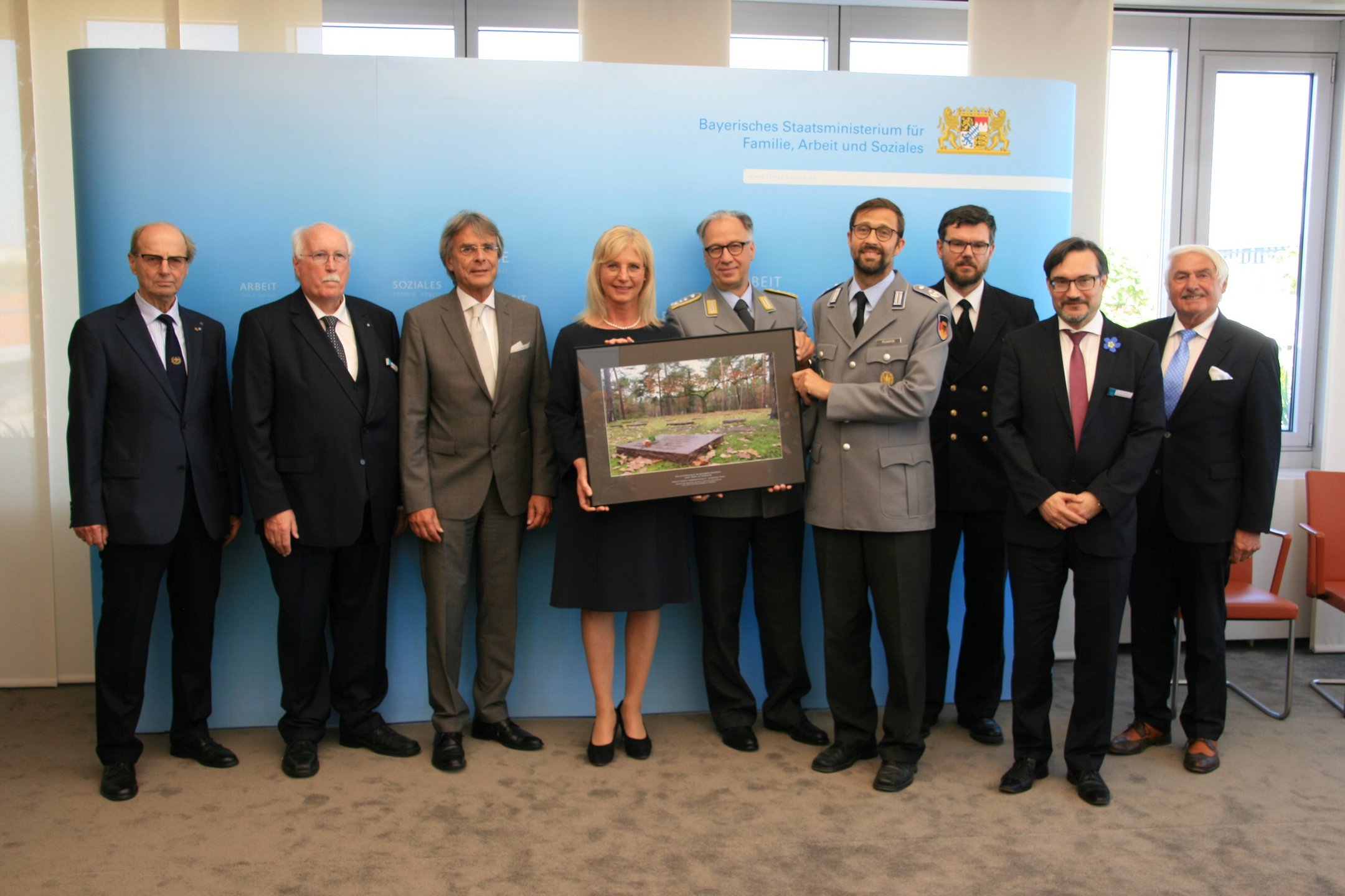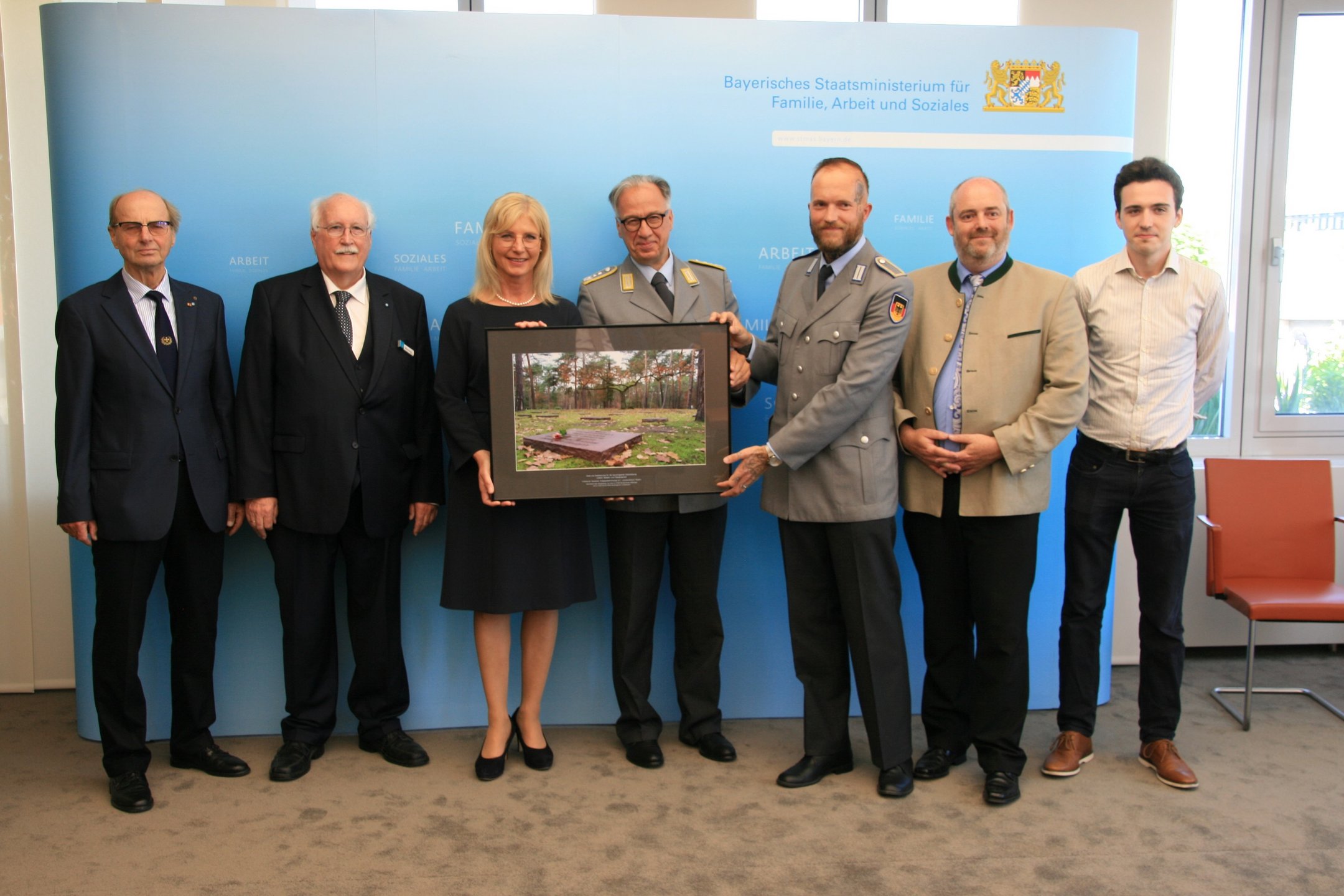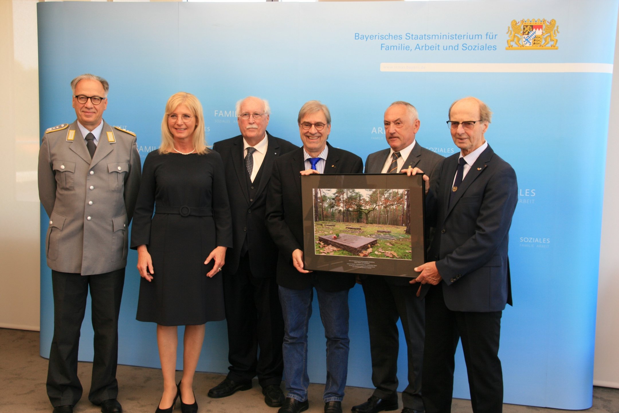Als Zeichen der Verbundenheit und des Dankes für die Unterstützung überreichte Volksbund-Landesvorsitzender, Regierungspräsident a.D. Wilhelm Wenning, die Großaufnahme auch als Zeichen des Danks an Ministerin Ulrike Scharf sowie an das Landeskommando Bayern, die Arbeitsgemeinschaft der Reservisten-, Soldaten- und Traditionsverbände in Bayern, die Bayerische Kameraden- und Soldatenvereinigung (BKV), den Verband der Reservisten der Deutschen Bundeswehr (VdRBw) und den Bayerischen Soldatenbund 1874 (BSB). Mit sehr persönlichen Worten dankte BSB-Präsident Oberst a.D. Richard Drexl, dessen Onkel auf der Kriegsgräberstätte Halbe ruht.
