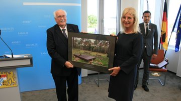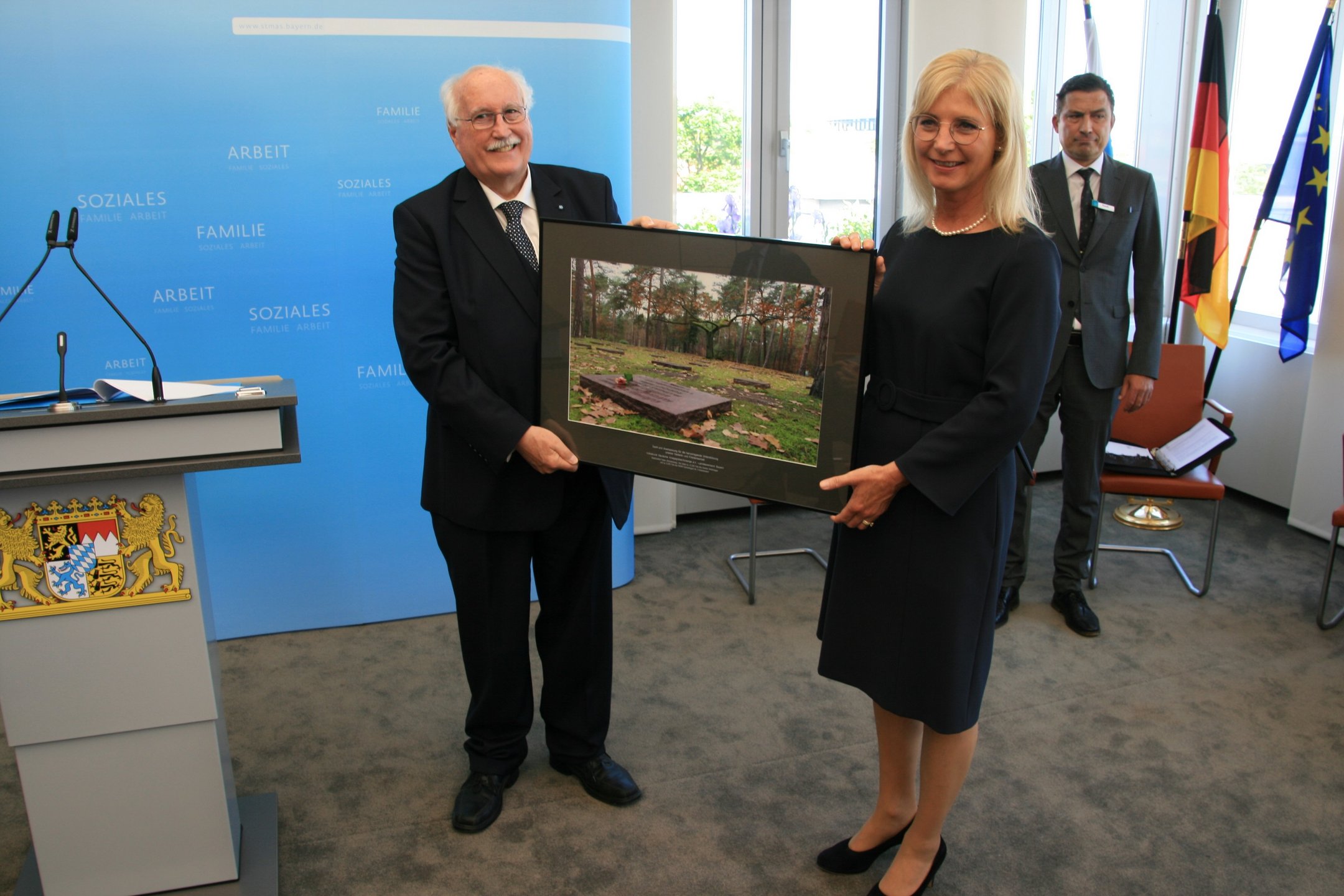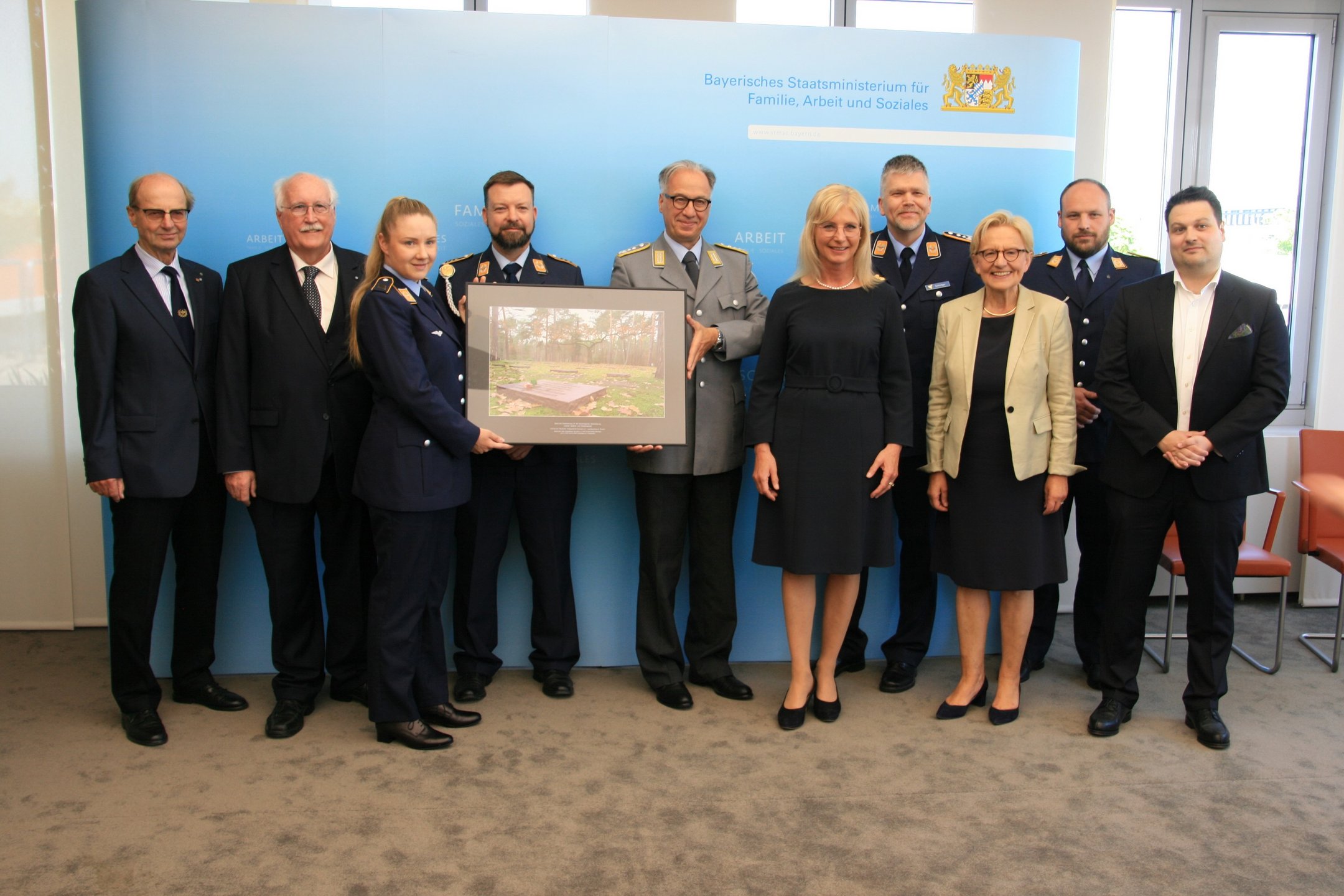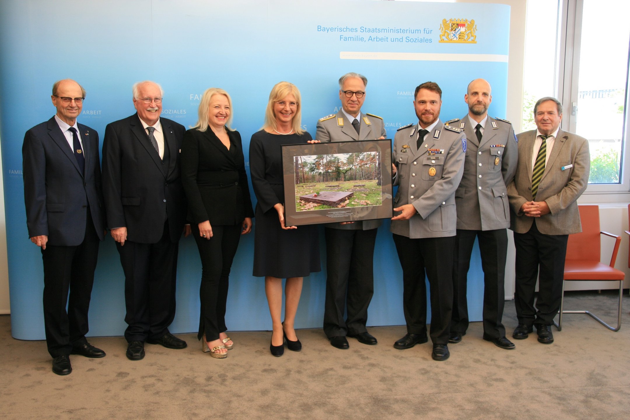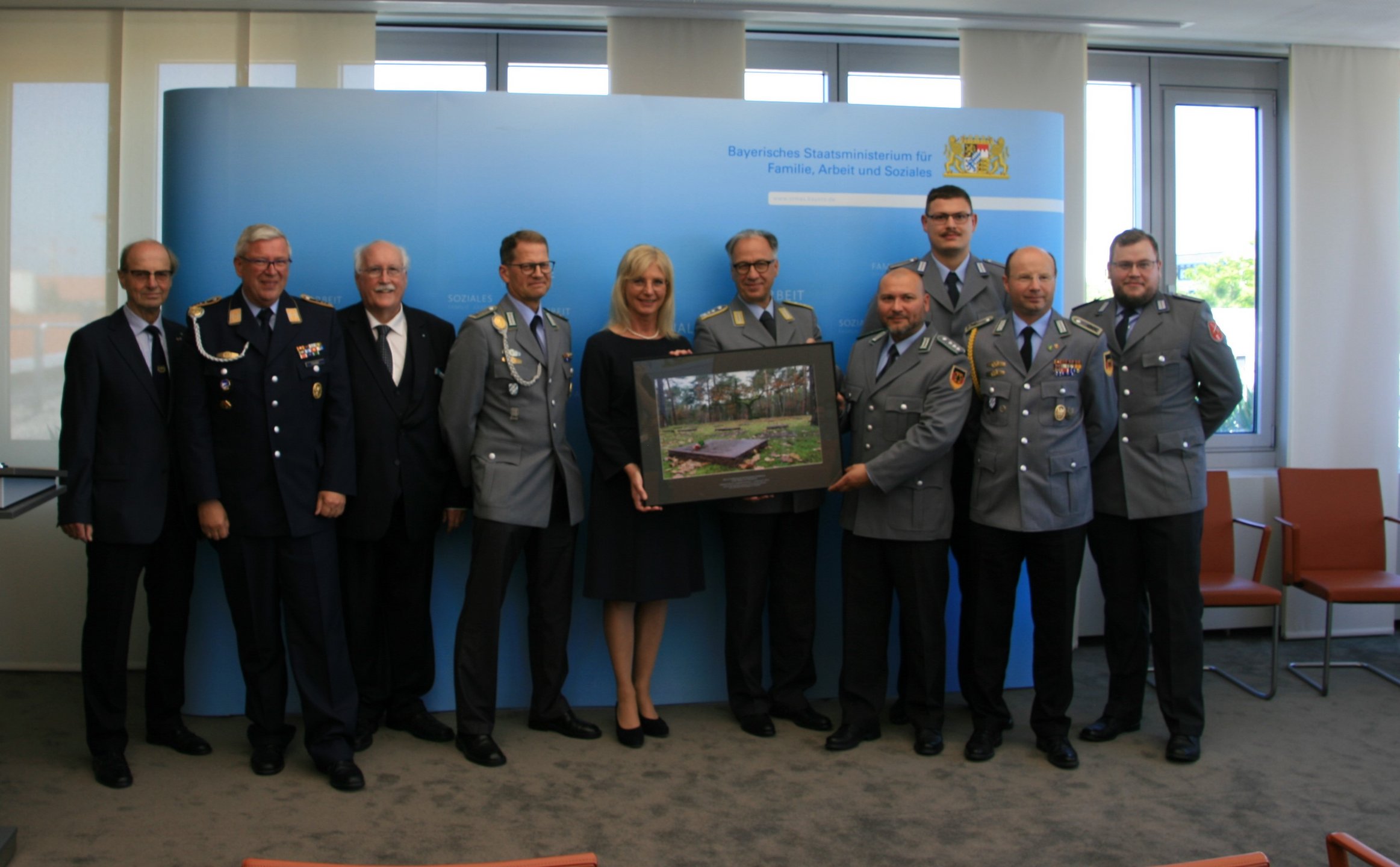 Als Zeichen der Verbundenheit und des Dankes für die Unterstützung überreichte Volksbund-Landesvorsitzender, Regierungspräsident a.D. Wilhelm Wenning, die Großaufnahme auch als Zeichen des Danks an Ministerin Ulrike Scharf sowie an das Landeskommando Bayern, die Arbeitsgemeinschaft der Reservisten-, Soldaten- und Traditionsverbände in Bayern, die Bayerische Kameraden- und Soldatenvereinigung (BKV), den Verband der Reservisten der Deutschen Bundeswehr (VdRBw) und den Bayerischen Soldatenbund 1874 (BSB). Mit sehr persönlichen Worten dankte BSB-Präsident Oberst a.D. Richard Drexl, dessen Onkel auf der Kriegsgräberstätte Halbe ruht.