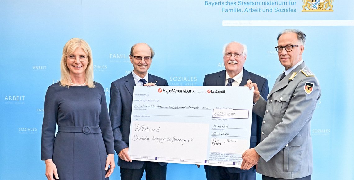 Symbol der Unterstützung für den Volksbund: Staatsministerin Ulrike Scharf präsentiert mit Landesvorsitzendem Wilhelm Wenning (Zweiter von rechts), Oberst Knuth Jung vom Landeskommando Bayern (rechts) und Generalmajor a.D. Jürgen Reichardt (ARST) den Spendenscheck über 1,682 Millionen Euro. Gert Krautbauer für StMAS